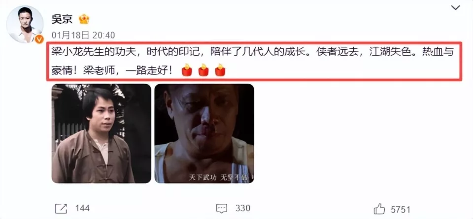 演员吴京则是以影迷的身份,表达了自己的哀悼,他称对方是时代的印记,陪伴了几代人的成长。