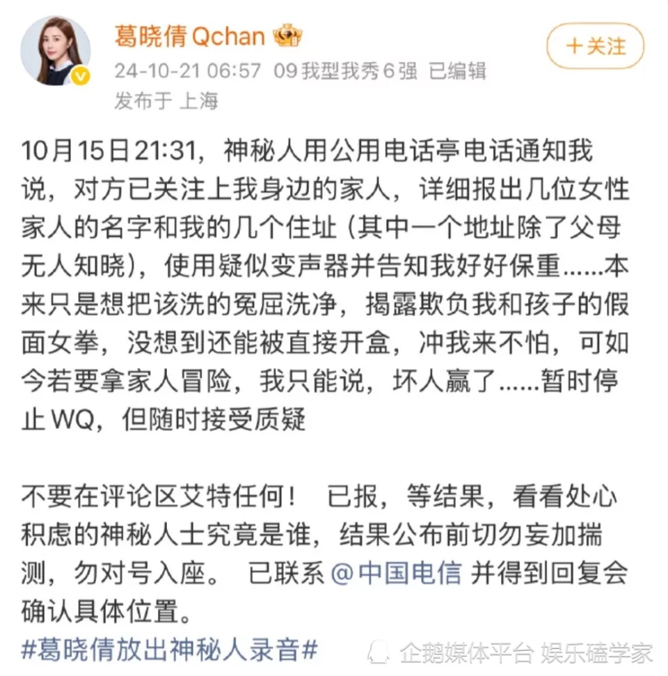 月,葛晓倩公开怒怼张雨绮,直指其插足自己与袁巴元的感情,还甩出监控实锤。怎料风波很快平息,张雨绮照常跑活动,反倒是葛晓倩自曝被神秘人威胁。同年10月,她更是透露接到公用电话亭来电,对方不仅叫得出她女性家人的名字,还精准掌握她多处住址。