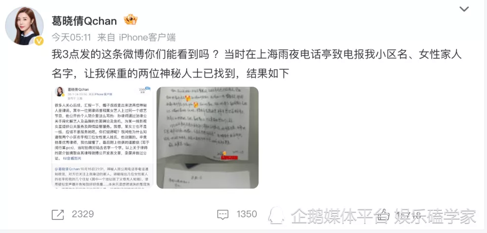 葛晓倩报警立案后,时隔一年多终于曝出进展。她直言涉事人员中有一名男律师,此人不仅曾和某女艺人同台综艺,简介里说“曾为某一线影视女星提供公关服务及舆情监管服务”。